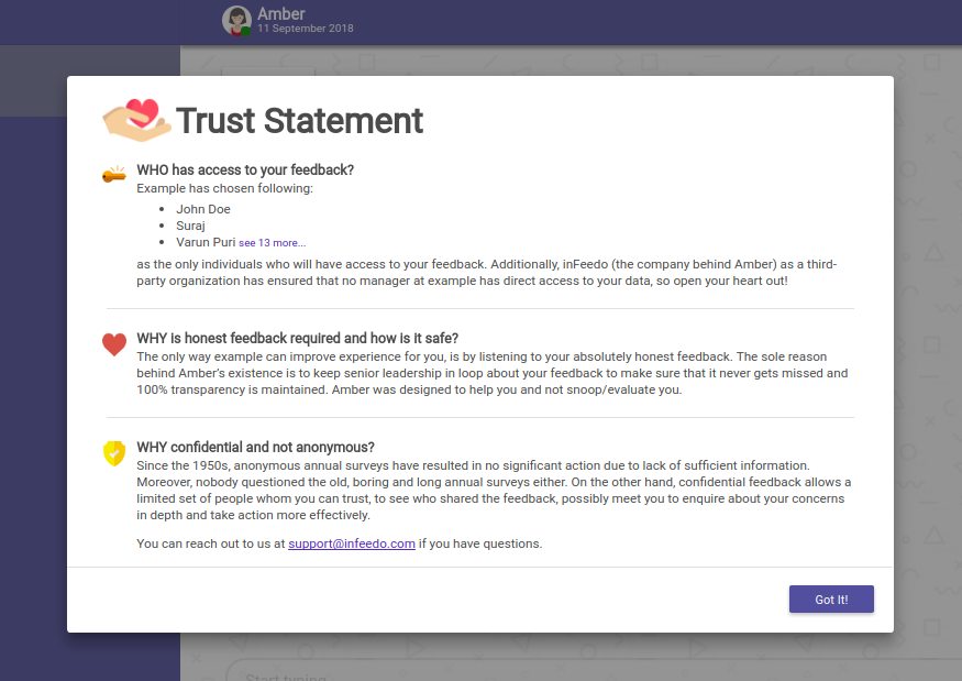 One of Amber’s core mission is to have people open up to her, be honest with her — trust her. Building trust is hard, even harder when you’re a chatbot in digital space asking people to share openly and freely about their experience at their company without fearing repercussions.